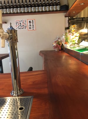 お店に入ってすぐに角付の立ち飲みスペースを作り そこにカウンターを設置するとのご希望でした。もともとオーナーがすでにご用意されていた蔵戸のイメージや 無塗装の耳突板を柿渋でご自身で塗装したいというご希望をお伺いして 材の選定~立ち会っていただきました。
